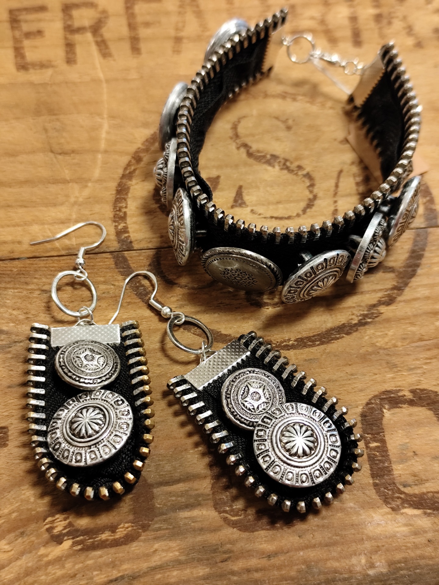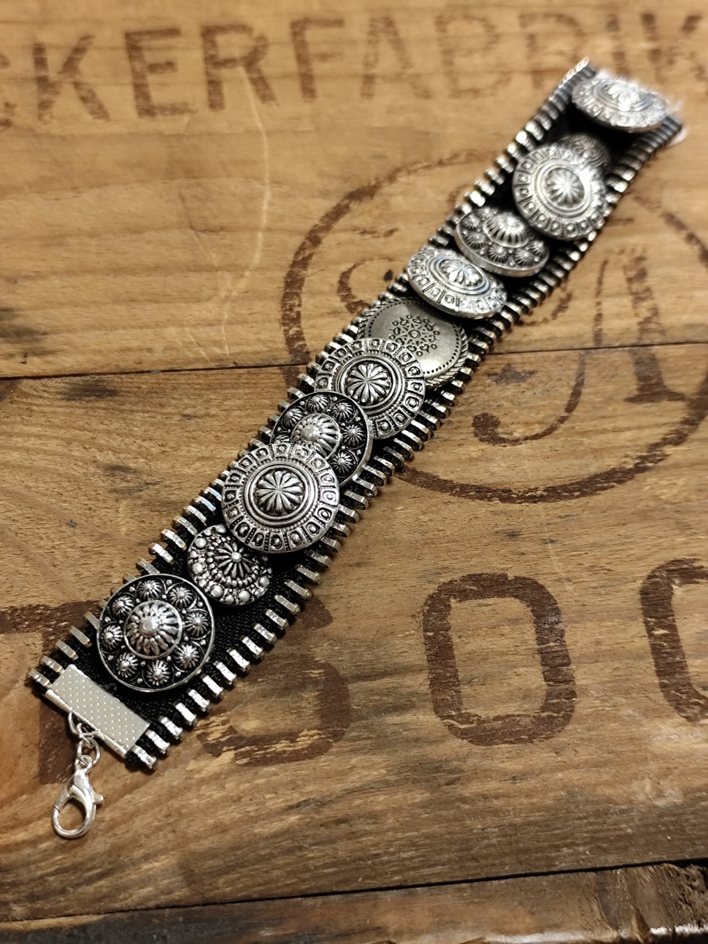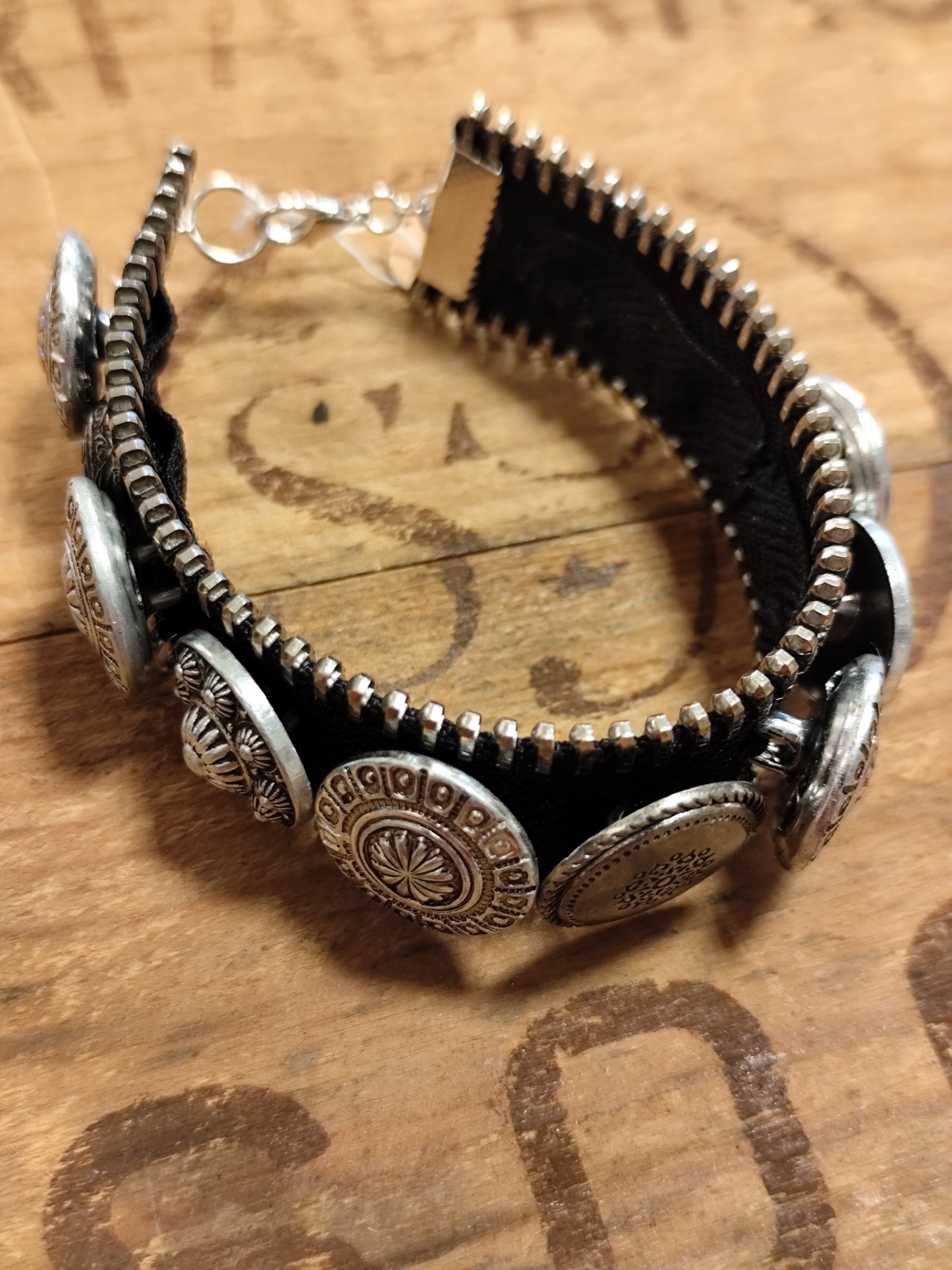 Armband av dragkedja med knappar. Längd 19,5 cm. Matchande örhängen kan ev finnas. Se örhängen.
