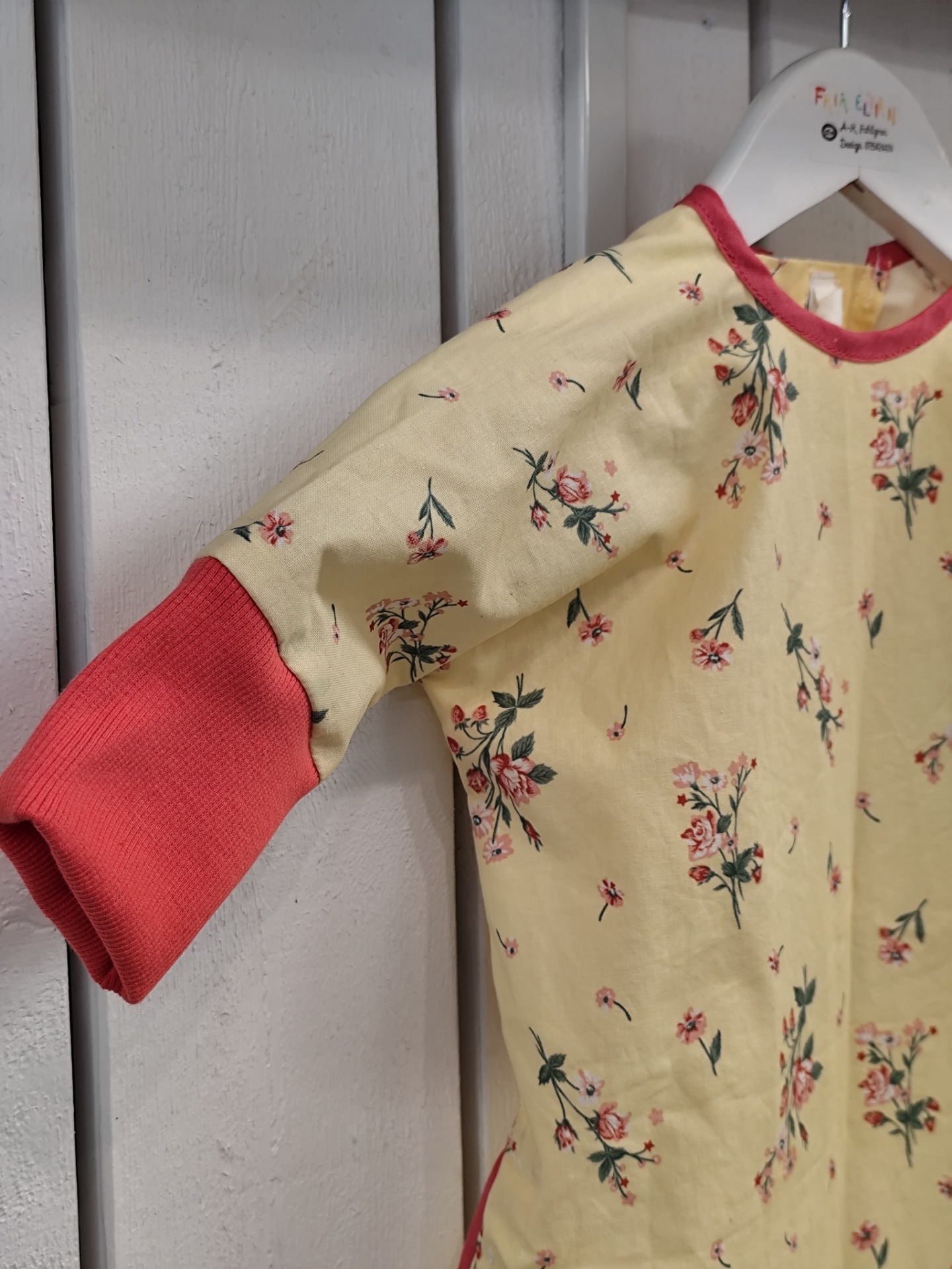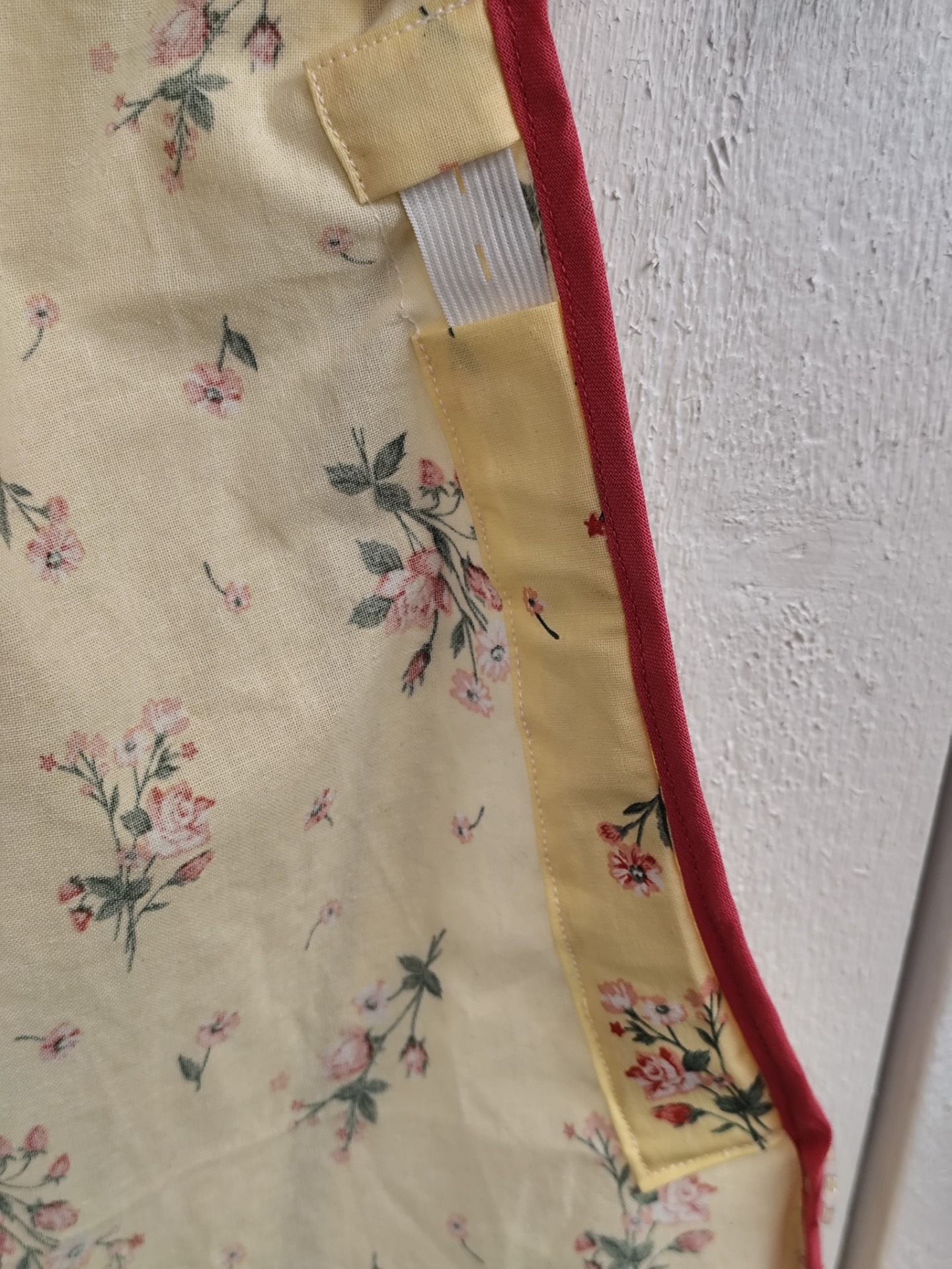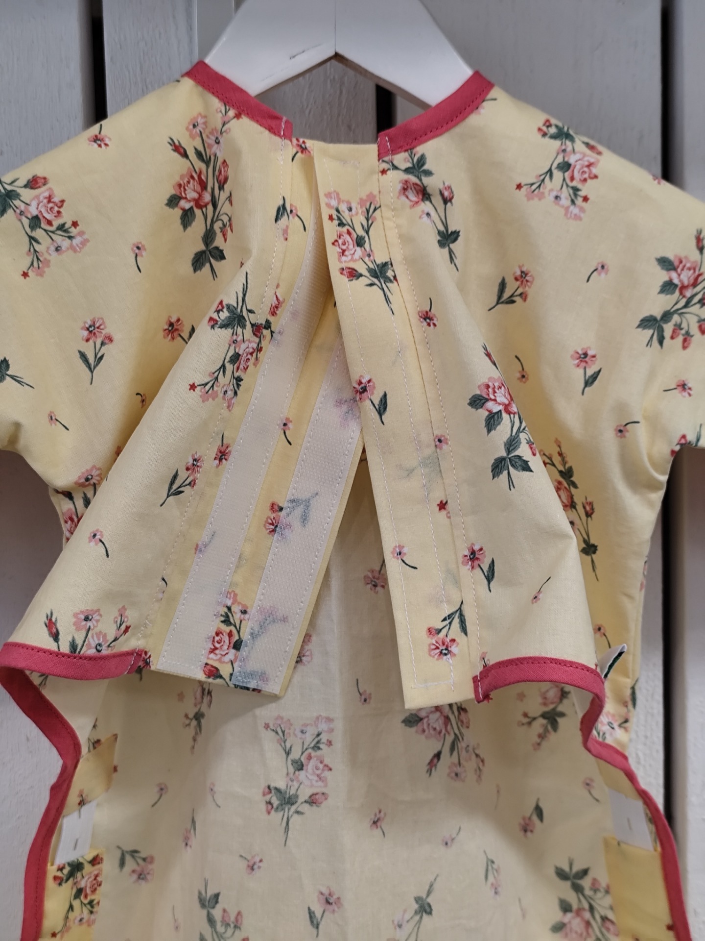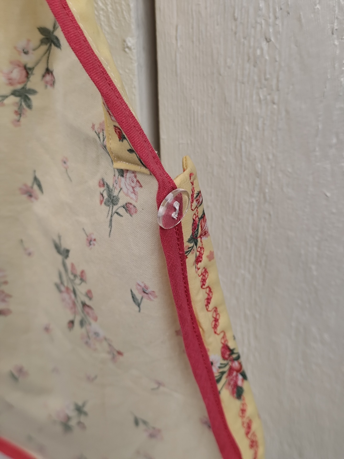 Haklappen ELLEN i blommigt tyg med rosa muddar och kantband.