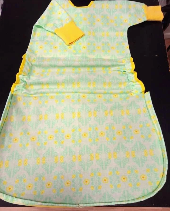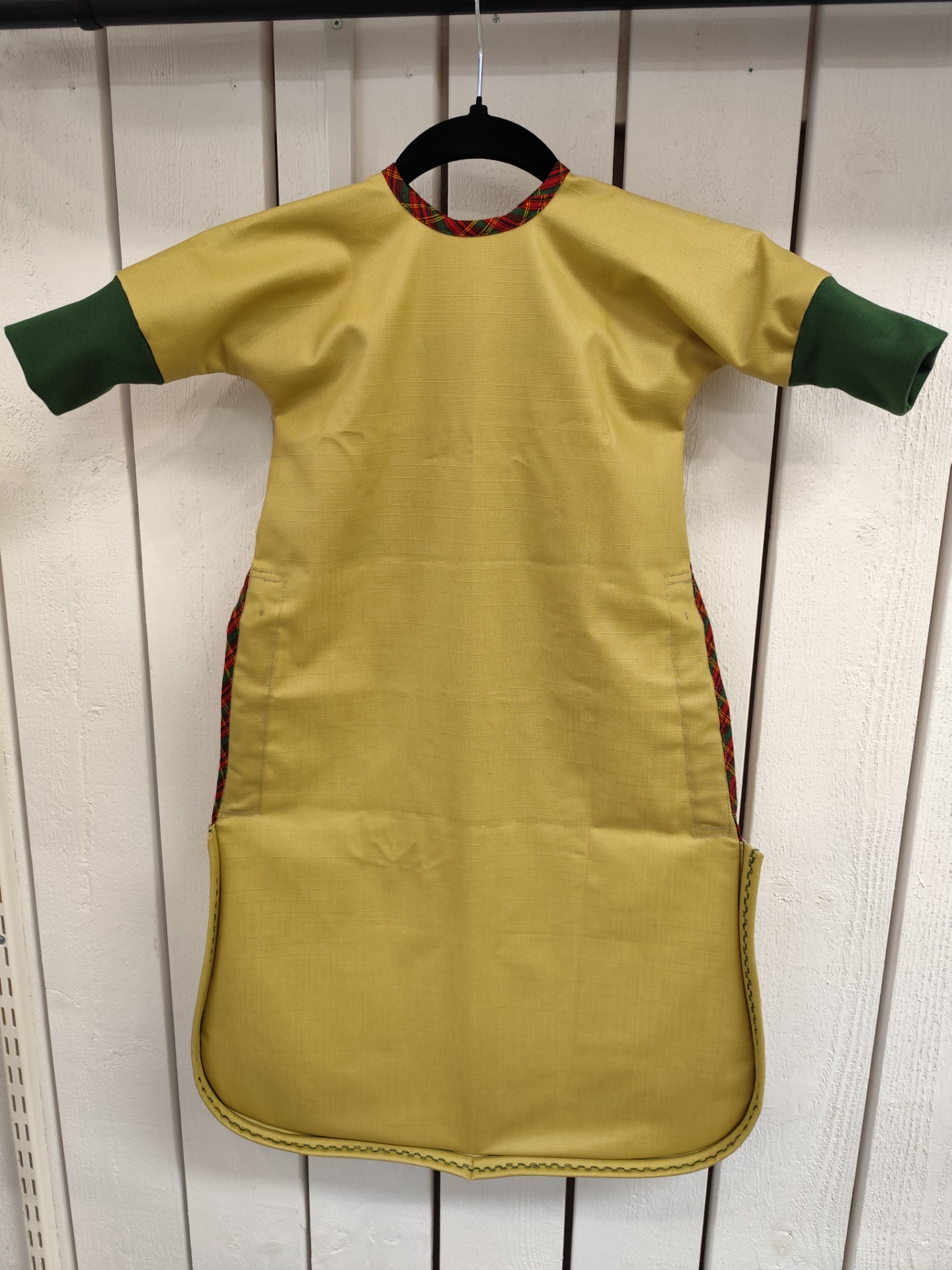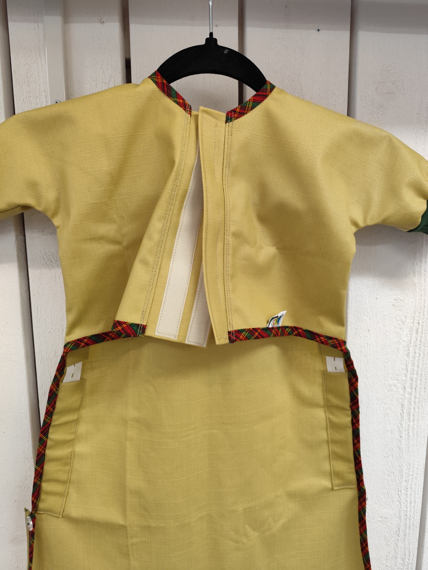 Haklappen ELLEN i senapsgult tyg med gröna muddar och grön/röd/gul rutigt kantband.