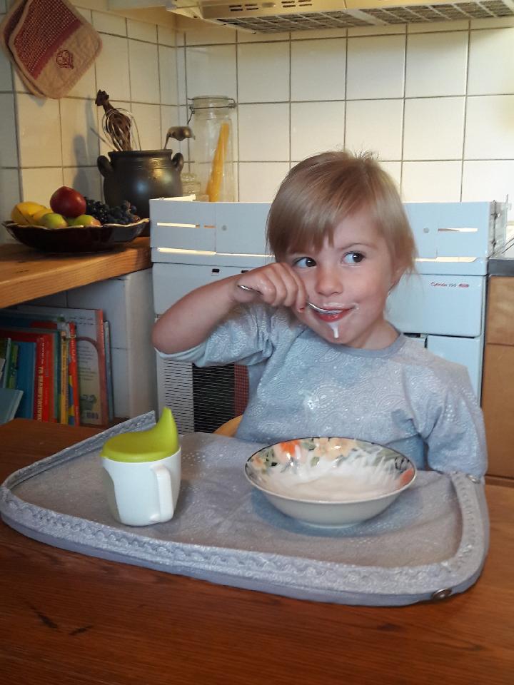 För minskat spill åt sidorna, finns på vardera sida (under) en dragsko med knapphålsresår för att kunna skåla knä-sektionen i önskat läge. Brickans mått 47*32 cm.