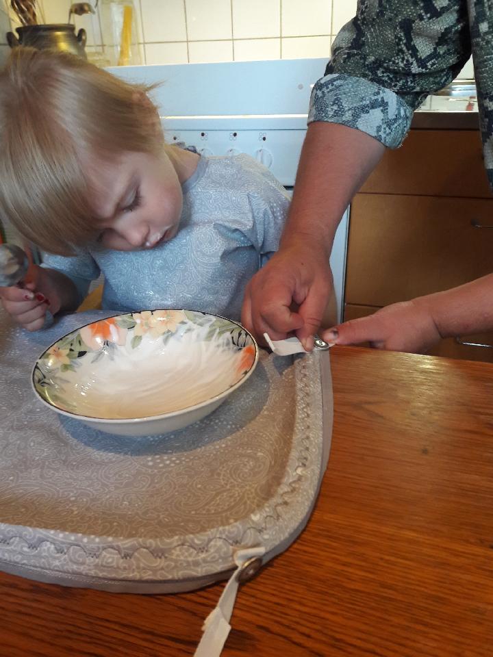 Om barnet tenderar att lyfta i brickan finns bomullsband med knapphålsresår för att montera haklappen vid bordet. Dessa fästes i brickans 4 knappar och spänns fast runt bordet.
