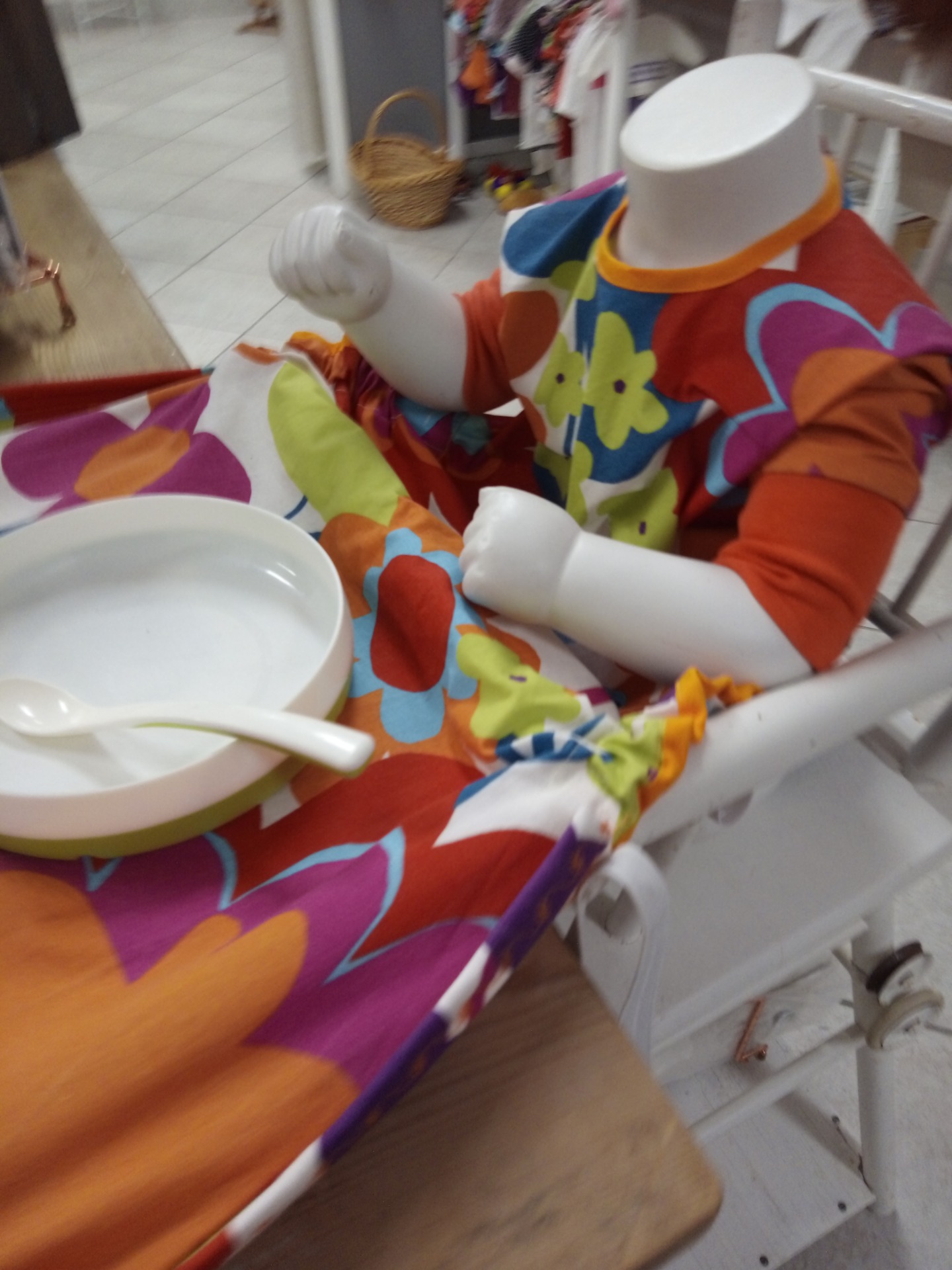 Denna haklapp skyddar mer än de traditionella haklapparna då den täcker både barnet, över knäet och bordet. Se mer information under bilder.