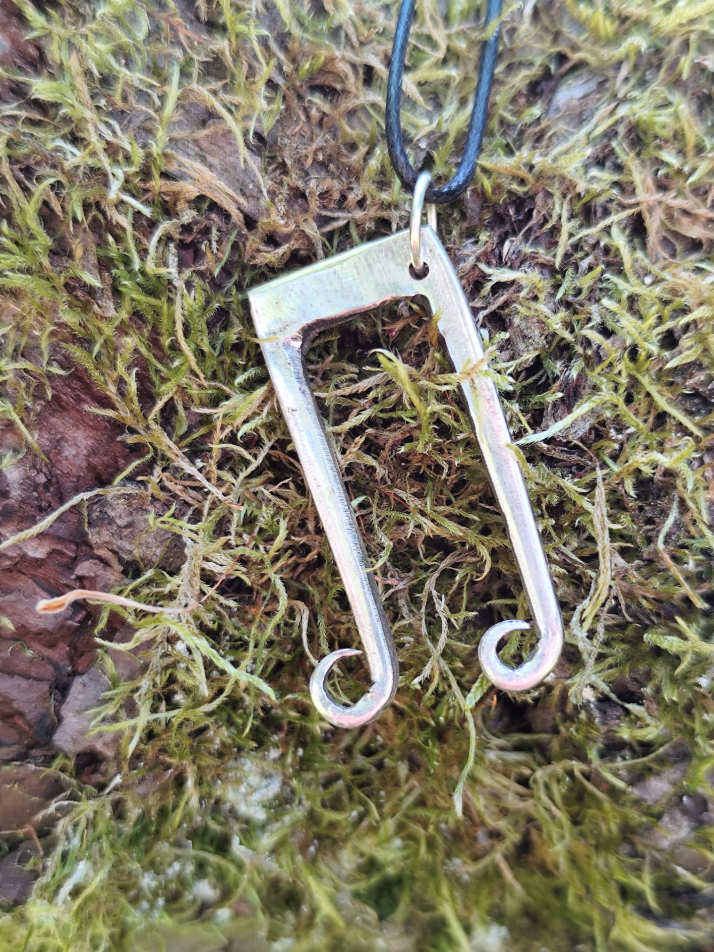 Halsband av gaffel i nysilver med svart bomullsband 1 mm bred och mellan 40 och 78 cm lång. Låses med karbinhake. Hänget är ca 4,5 cm.