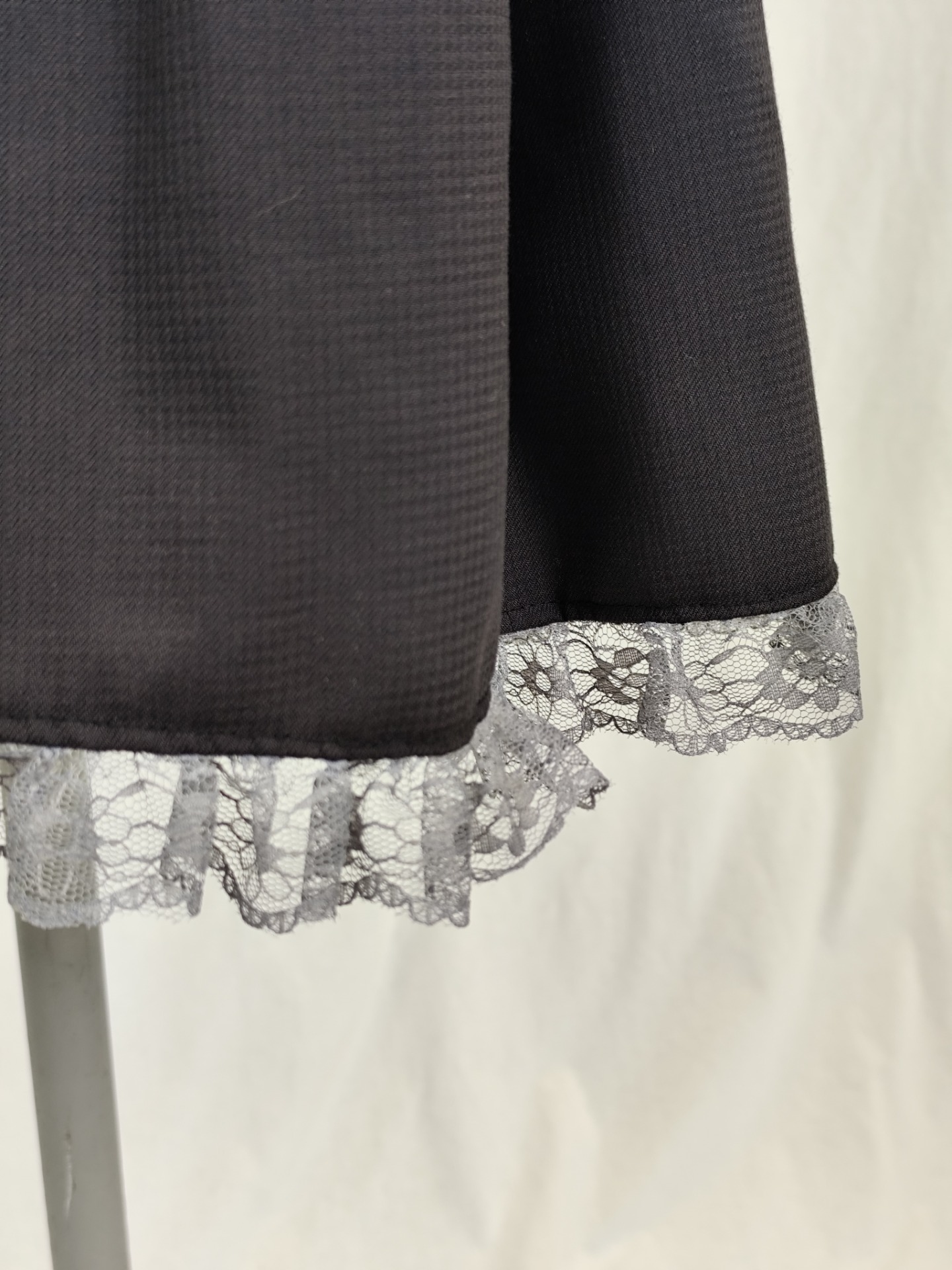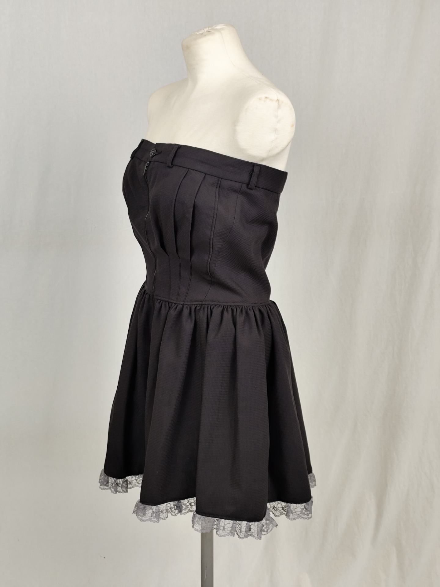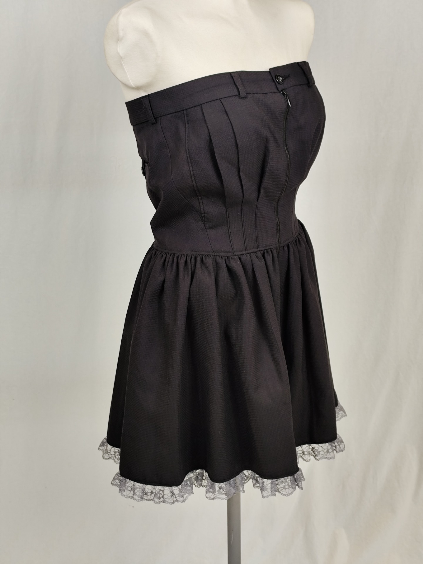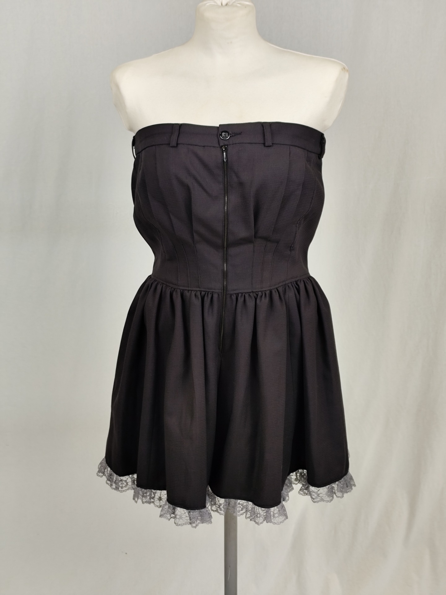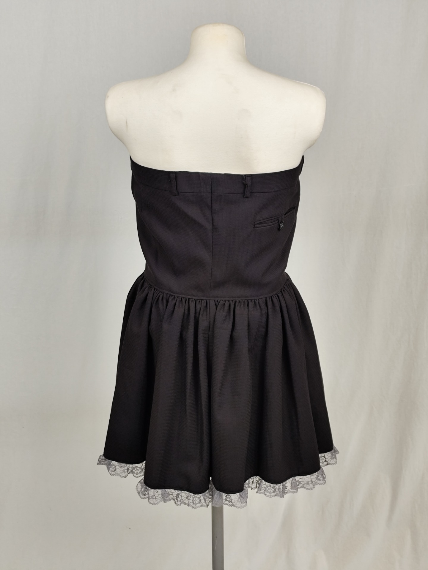 Klänning av grå kostymbyxor med medföljande slips att använda som skärp i hällorna över bysten. Klänningen har dragkedja och knapp fram och spetskant nertill.