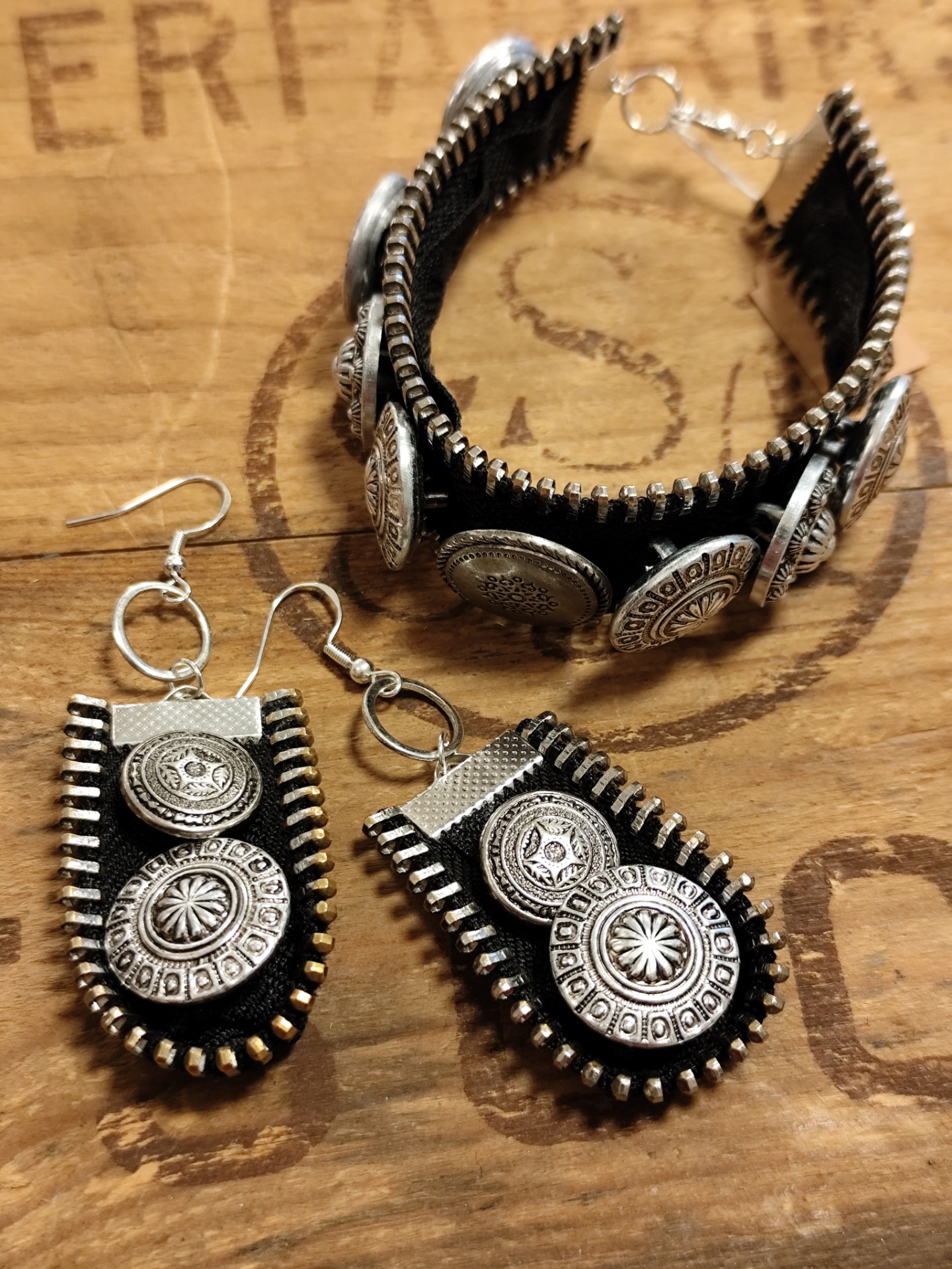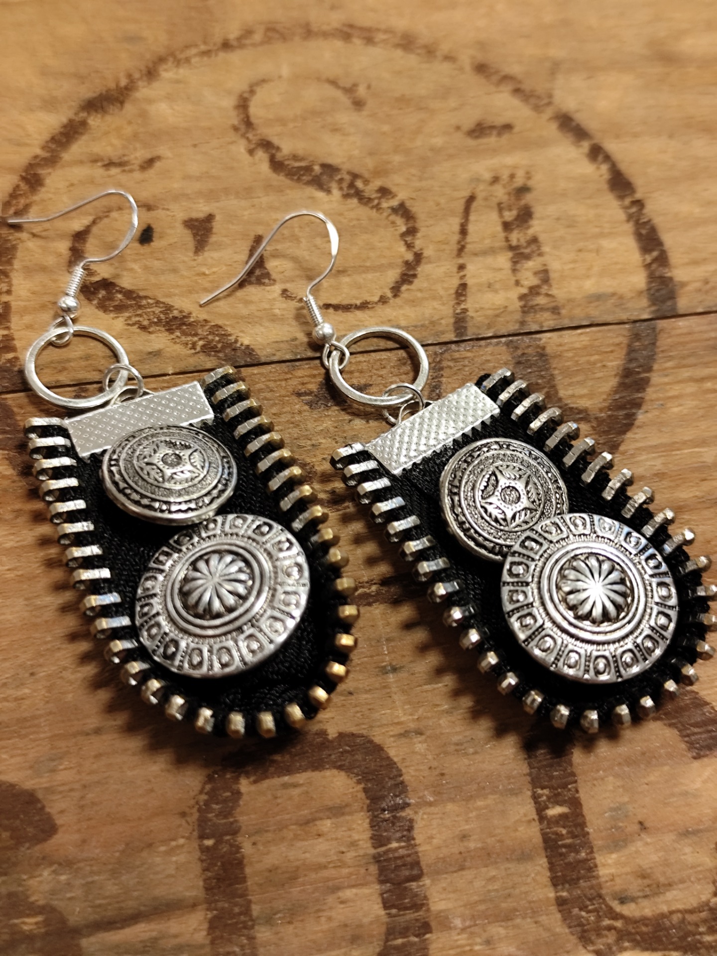 Örhängen av dragkedja med knappar. Längd 8 cm. Matchande armband kan ev finnas. Se armband.