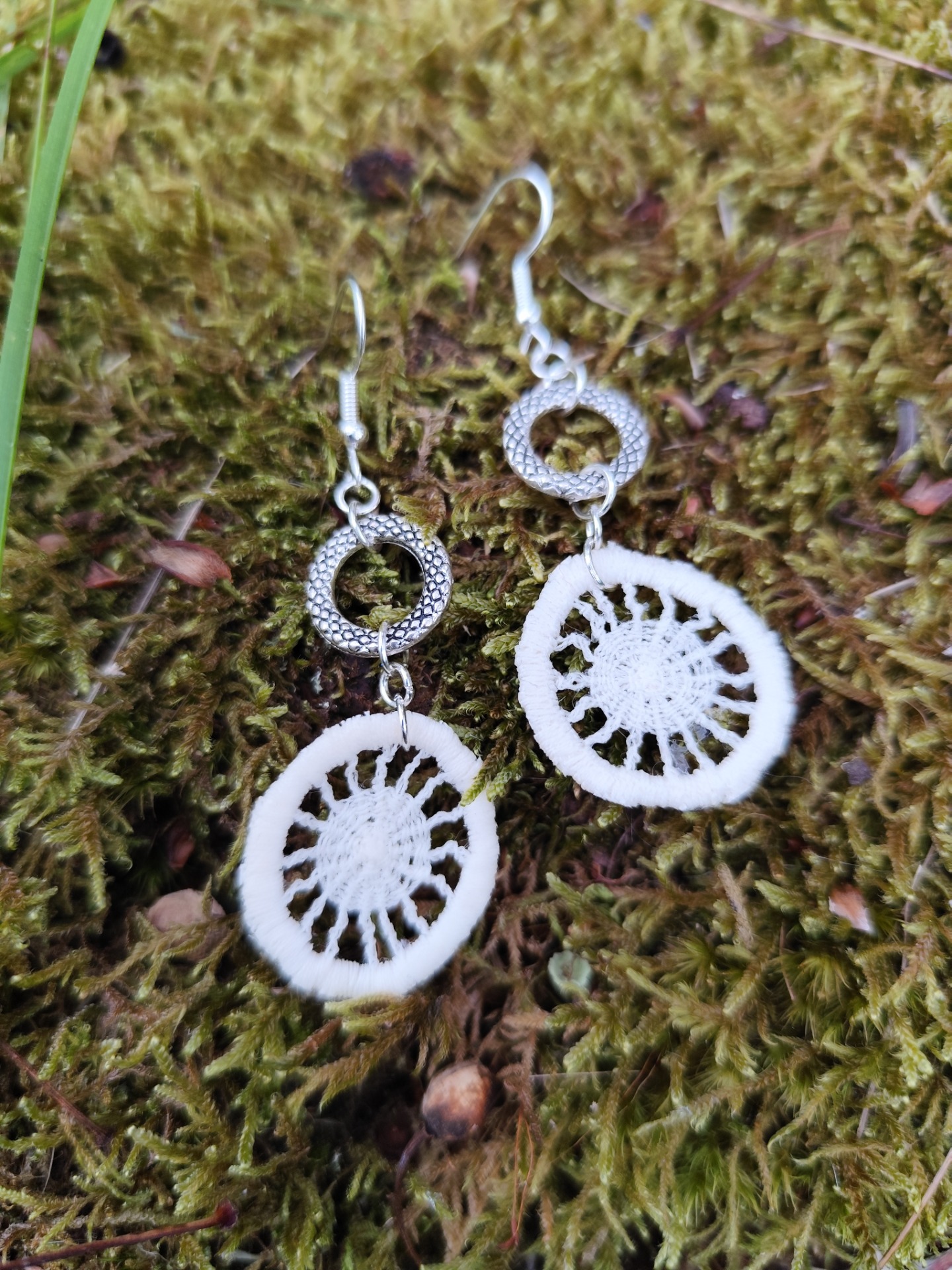 Örhängen av stärkt spets med silverplätterade krokar och detaljer.