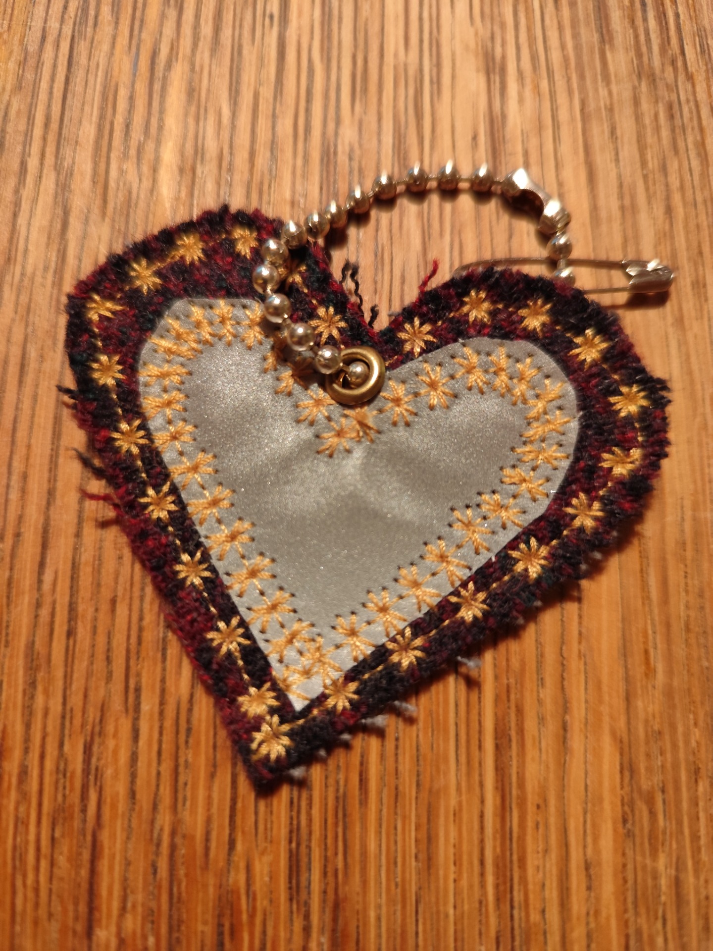 Spillbitar av tweed och möbeltyg från olika Re-design projekt blir bland annat dessa hjärt reflexer. Botten på denna är av röd-mönstrat tyg med reflex tyg. kulkedja och säkerhetsnål medföljer för att på bästa sätt kunna fästa reflexen på önskat ställe.