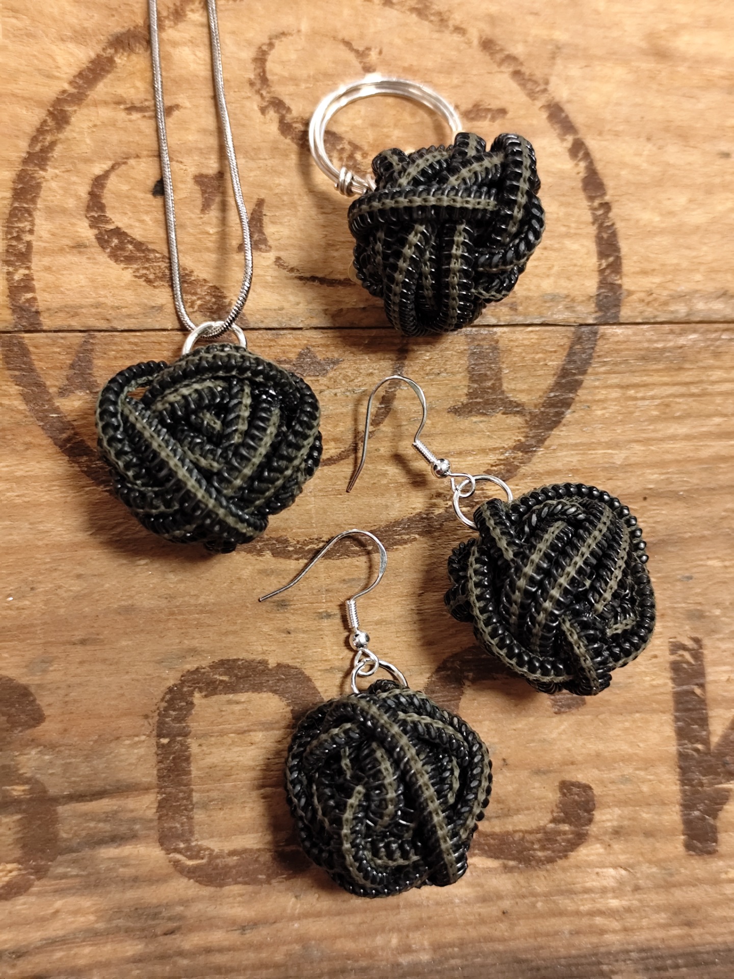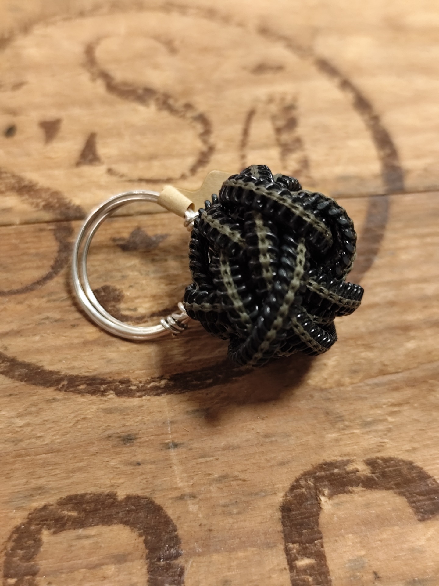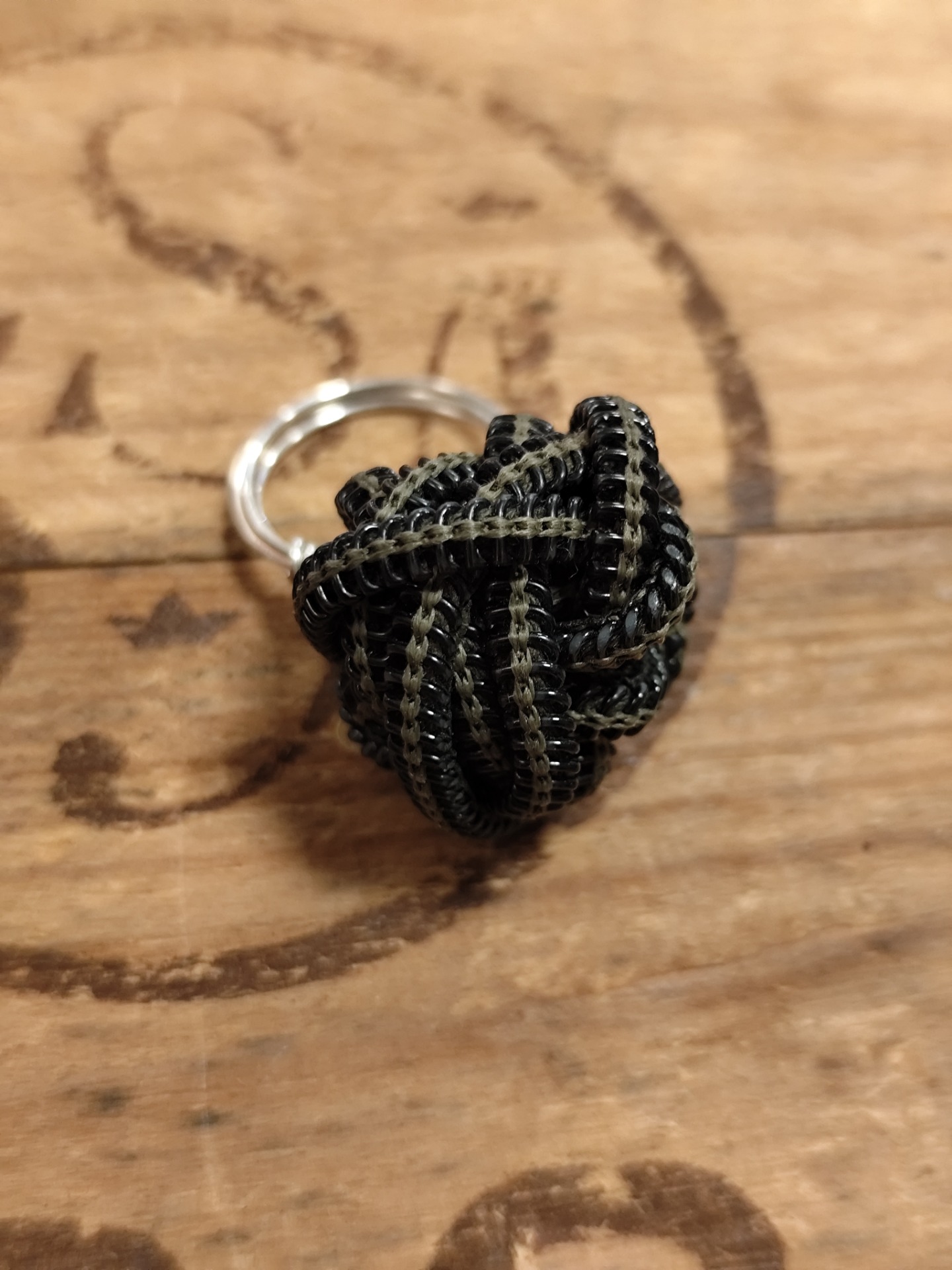 Ring tillverkad av mörk grön dragkedja i plast med silverplätterad kedja.