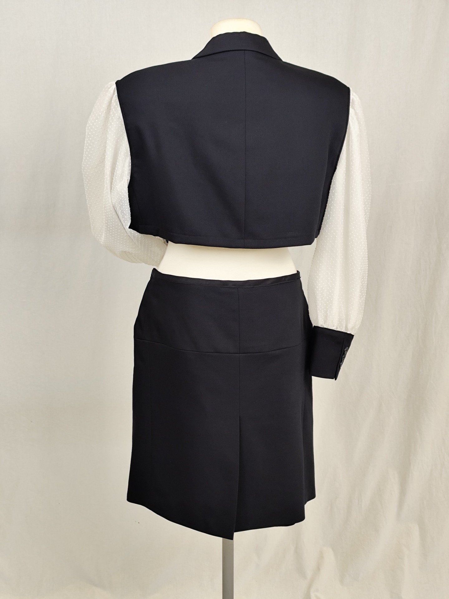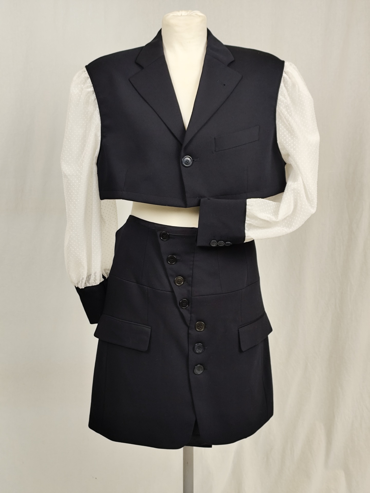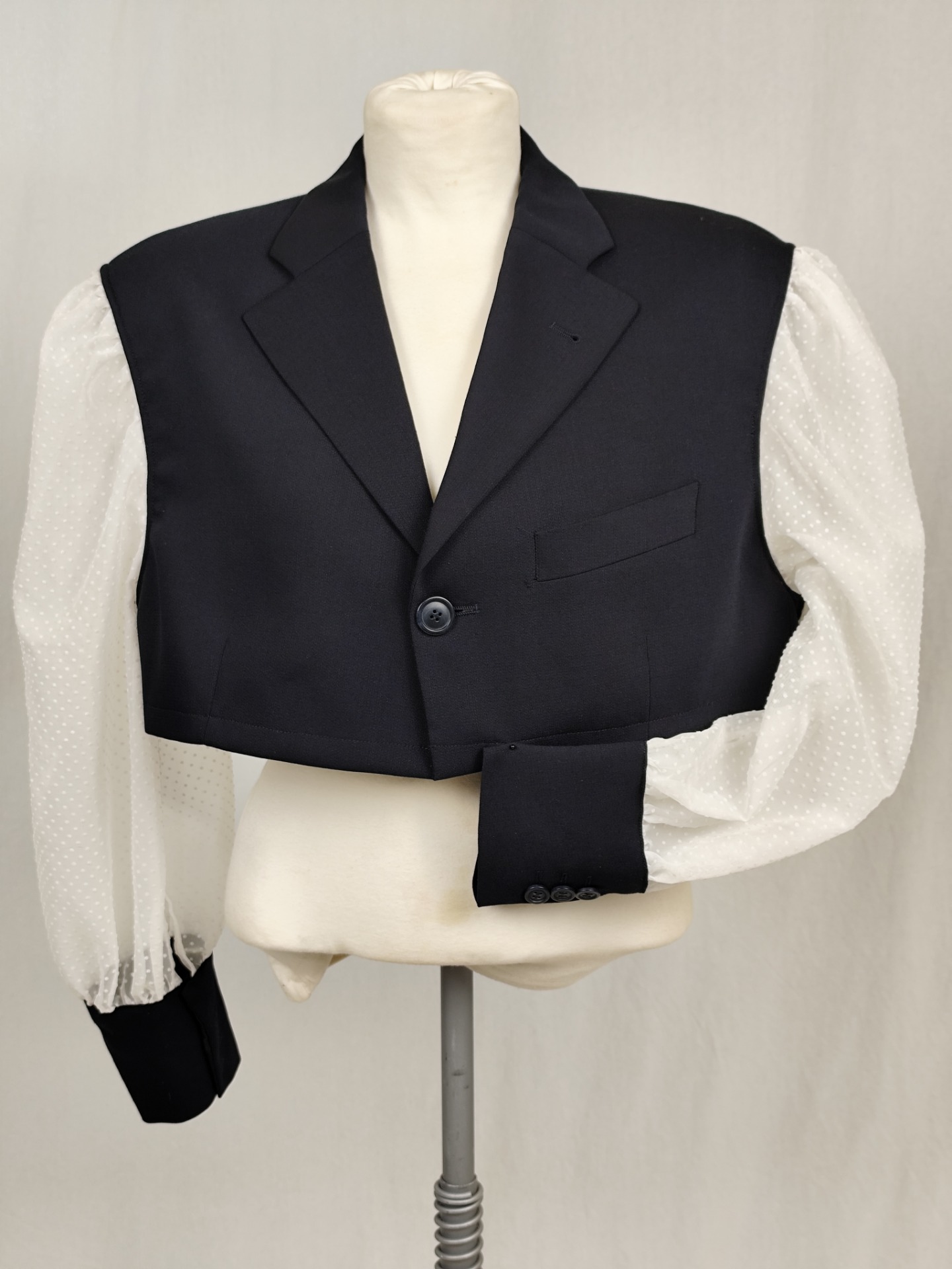 Storlek 42Kort jacka med tillhörande kjol tillverkade av en svart kavaj och ett vitt tylltyg.