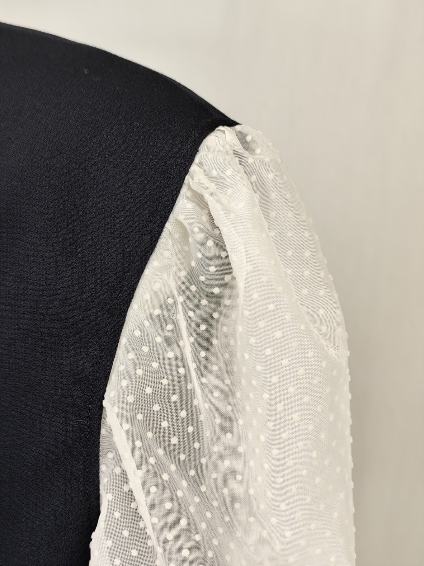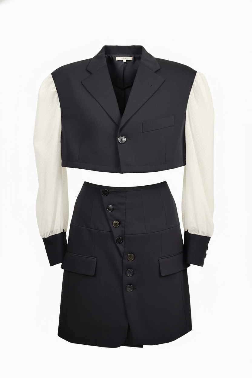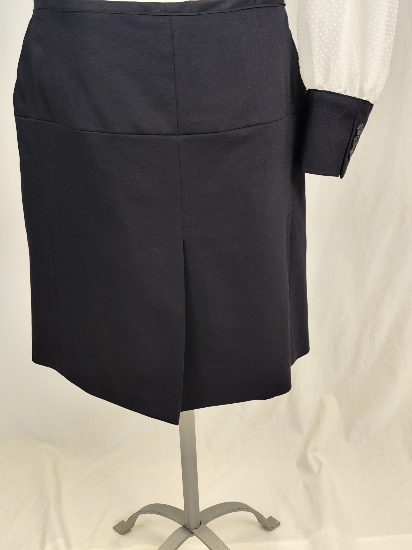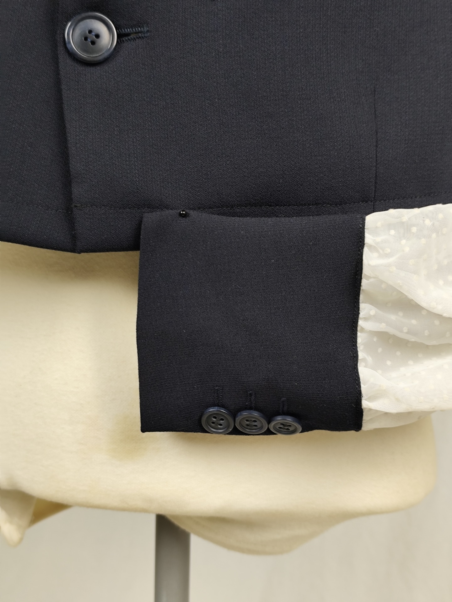Storlek 42Kort jacka med tillhörande kjol tillverkade av en svart kavaj och ett vitt tylltyg.